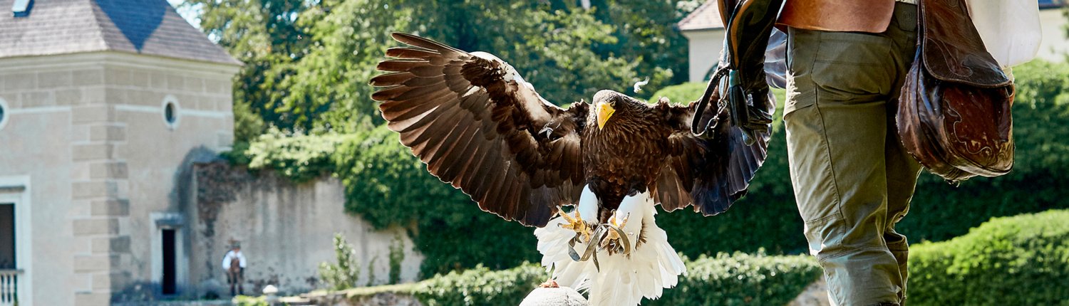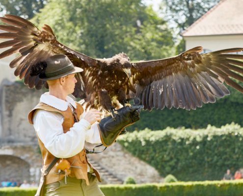 Bei einer exklusiven Greifvogelvorführung in historischen Gewändern erleben Sie die Leichtigkeit des Fliegens und begegnen dem König der Lüfte. Schon in ältesten Zeugnissen unserer Zeit gilt der Adler als Seelenvogel – ihm zu begegnen verheißt Glück.
